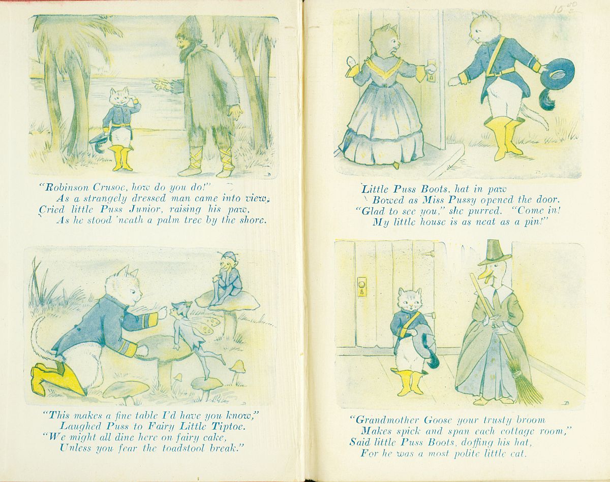 The Project Gutenberg EBook of Puss Junior and Robinson Crusoe, by David Cory This eBook is for the use of anyone anywhere at no cost and with almost no restrictions whatsoever. You may copy it, give it away or re-use it under the terms of the Project Gutenberg License included with this eBook or online at www.gutenberg.org Title: Puss Junior and Robinson Crusoe Author: David Cory Illustrator: E. J. Babcock Release Date: May 25, 2010 [EBook #32535] Language: English Character set encoding: ISO-8859-1 *** START OF THIS PROJECT GUTENBERG EBOOK PUSS JUNIOR AND ROBINSON CRUSOE *** Produced by Suzanne Shell, Emmy and the Online Distributed Proofreading Team at https://www.pgdp.net