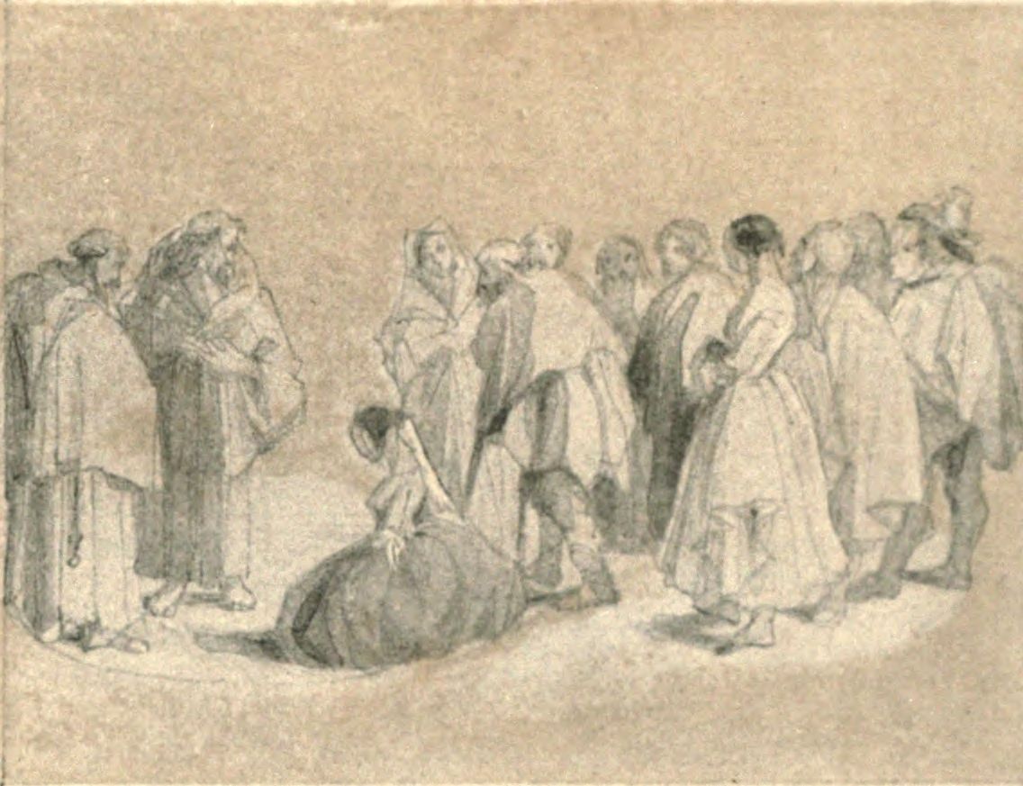 Nothing will teach you to compose a picture like sketching, however slightly, the different groups you encounter in walking about; never be without a little book for this purpose, as the merest draught will, when you are composing, apply itself to your picture better than any thing that may be suggested. I have invariably found this the best resource. Take first the exact outline, shape, and position of the figure, and afterwards the expression of what he is doing, carefully noticing the shadowed parts, and dividing them boldly from the light; the half-tints may be blended with comparative ease; therefore make as few lines as possible, never encumbering them. That part of the figure which is foreshortened will have the greater number of folds, while that which is not, will come out plain and bold. Such memoranda will always have a look of reality over every other means of obtaining it.