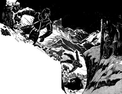 They moved in a world of snow and ice and screaming wind. Great pinnacles and ridges, worn into fantastic shapes by the gale, towered on every side. The curtain of snow occasionally lifted to reveal white hills marching upon white hills, huge, glittering ice sheets, yawning chasms. And sometimes, farther in the distance, there would be awesome alien vistas.