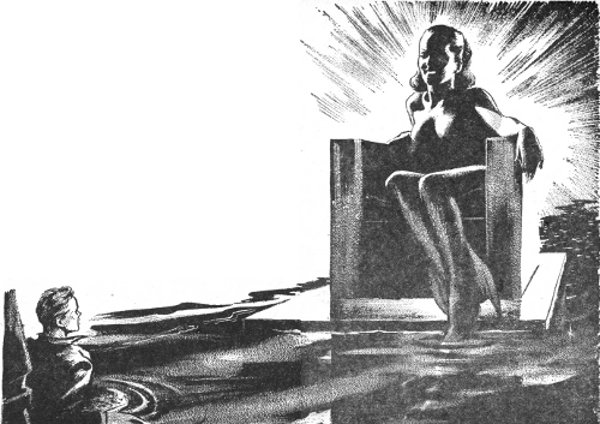 Pete struggled to his feet and found his strength flowing back. And being the kind of man he was he plunged into the dark pool of cool water and swam toward the great throne. It was much farther than it seemed, and when at last he got there he found the throne was as tall as an office building in the great cities of earth, and the lovely mer-woman's body as mighty as a Titan of earth's misty dawn. Big she was, and just as beautiful close up as from the far shore of her pool.