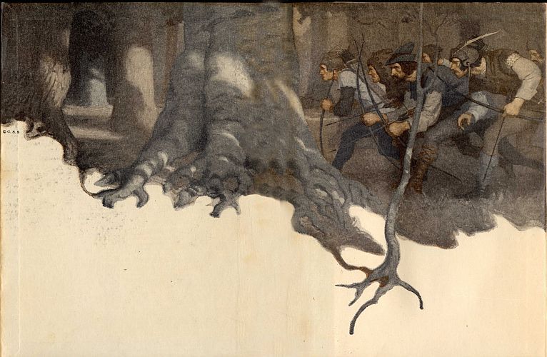 And, sure enough, over the top of the forest, where it ran down in a tongue among the meadows, and ended in a pair of goodly green elms, about a bowshot from the field where they were standing, a flight of birds was skimming to and fro, in evident disorder.