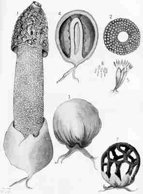 The volva is a membrane which envelops the entire plant in embryo, giving it the appearance of an egg. It originates at the base of the mushroom and furnishes it, during its fœtal life, with the means of support and nourishment. Its texture is so delicate that it generally disappears, leaving very little trace of its existence on the adult plant. In many of the volvate species this organ exists only so long as they are under ground, and some mycologists restrict the term "volvati" to such only as retain it afterwards. As the young plant expands it breaks through the top of this volva or wrapper, and, emerging, carries with it patches of the membrane on the upper surface of the cap. These are more or less prominent, numerous, and thick, sometimes irregularly disposed, sometimes regularly in the form of plates, warts, etc. At the base of the stem of the mushroom the remains of the volva are seen in the form of a sort of wrapper. This is more or less ample, thick, and ascending. It is called free when it is loose or easily detached from the stem, and congenital when it cannot be separated from it without laceration. In some species it is distinctly membranous, and in others floccose, and friable in character, sometimes appearing in ridges as a mere border, at others broken up into scales, and, as the plant matures, wholly disappearing. The volva is a feature of great importance in the study of the Agaricini, of the subgenera Amanita, Volvaria, etc.