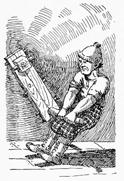 The buckskin harness used on Babe and Benny when the weather was rainy was made by Brimstone Bill. When this harness got wet it would stretch so much that the oxen could travel clear to the landing and the load would not move from the skidway in the woods. Brimstone would fasten the harness with an anchor Big Ole made for him and when the sun came out and the harness shrunk the load would be pulled to the landing while Bill and the oxen were busy at some other job.