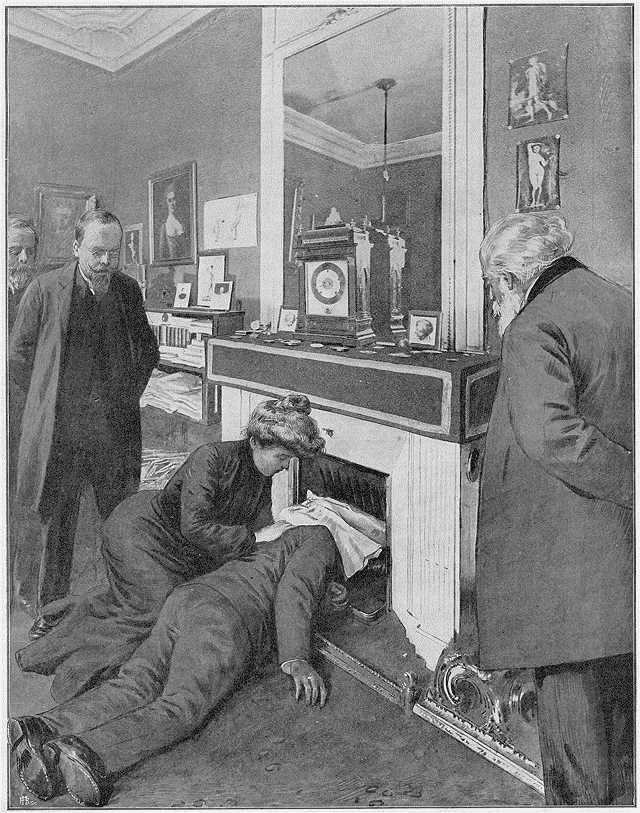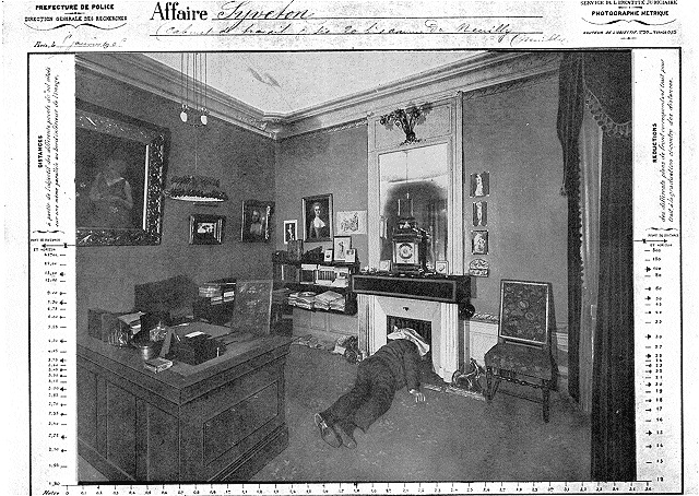 devant la cheminée d'un agent de la sûreté figurant le cadavre.