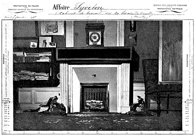 La tache noire que l'on aperçoit au milieu du manteau blanc de la cheminée est un débris des scellés de justice qui fermaient le tablier et qui ont été brisés pour les expertises judiciaires.