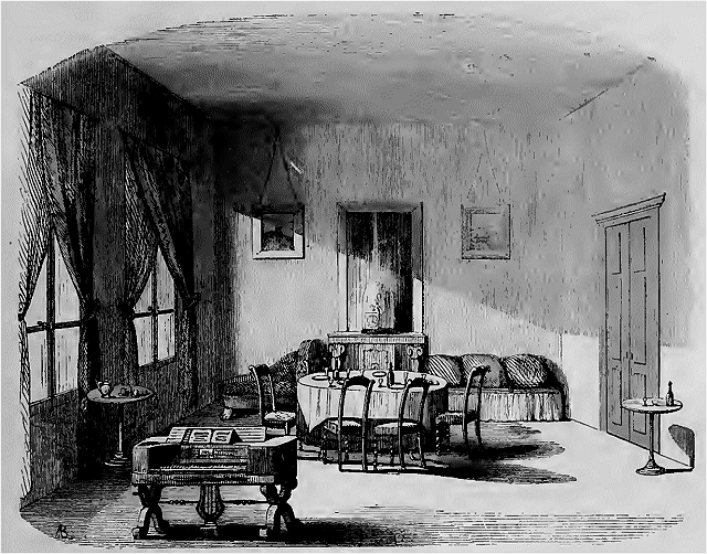 M. Bruat emporte avec lui une maison en bois qu'il fera monter à son arrivée aux îles Marquises. Cette maison, que le ministre de la marine a fait construire par M. Potter, entrepreneur, est couverte en zinc; elle se compose d'un rez-de-chaussée et d'un premier étage, au rez-de-chaussée, auquel on parvient par un perron de six marches, vestibule, antichambre, bureau, cabinet de travail, salle à manger, salon de réception, salle de billard; au premier étage, chambres, cabinets, et pour l'habitation personnelle du gouverneur et de sa famille.