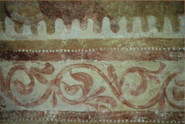 185. Saint-Loup. La tour romane. L'étage inférieur est orné au nord et au sud d'une double arcature aveugle en plein-cintre. Celle-ci est surmontée d'un cordon saillant se prolongeant en un bandeau droit sur le nu du mur se poursuivant ensuite sur les faces est et ouest. Photo d'Alain Dermigny. [Alain-100]