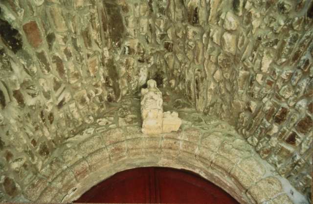 030. Bréville. La porte romane, à la base de la tour, côté sud. L'archivolte surmontant l'arcade en plein-cintre repose à droite sur une pierre de granit sculptée d'une tête humaine. Photo d'Alain Dermigny. [Alain-014]