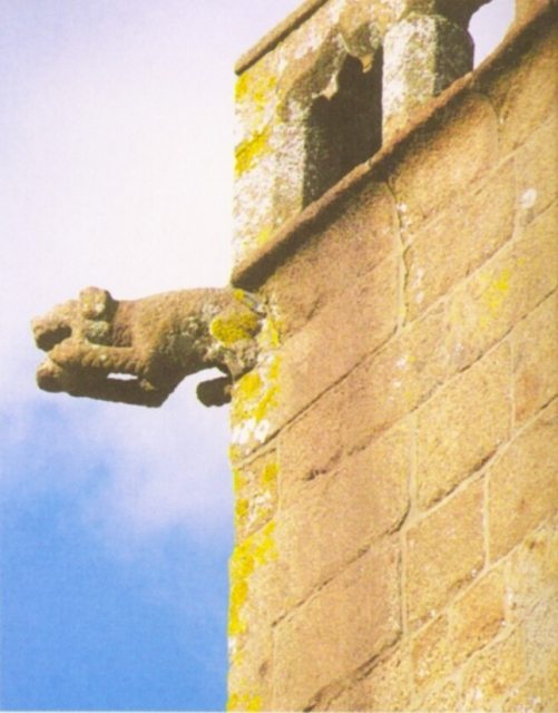 142. Genêts. Une gargouille gothique ornant un autre angle de la balustrade cachant le départ du toit en batière de la tour. Photo de Claude Rayon. [Claude-41]