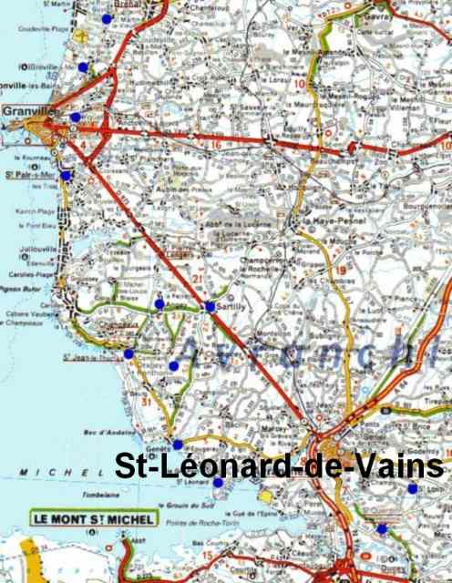 155. Saint-Léonard-de-Vains. Emplacement. Le village de Saint-Léonard-de-Vains est situé à l'extrémité du cap du Grouin du Sud, à deux kilomètres et demi du bourg de Vains et sept kilomètres de la ville d'Avranches. L'église prieurale domine la baie du Mont Saint-Michel et le rocher de Tombelaine. Saint-Léonard-de-Vains était le point d'arrivée de la voie montoise venant de Caen, avant la traversée vers le Mont Saint-Michel, destination finale de nombreux pèlerins. L'église étant devenue une propriété privée depuis la Révolution française, ce village est désormais rattaché à la paroisse de Vains.