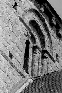 186. Saint-Loup. La tour romane. A l'étage inférieur, un petit appareil décoratif réticulé (pierres losangées) est présent à l'écoinçon des arcatures jumelles. Photo d'Alain Dermigny. [Alain-101]