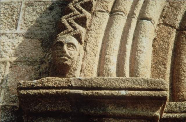 210. Portail de Sartilly. L'extrémité de l'archivolte (côté gauche). L'archivolte est formée d'un cordon saillant orné de dents-de-scie en fort relief sculptées en creux d'une rangée de bâtons brisés. De chaque côté de l'arcade, elle repose sur une tête sculptée aux traits bien dessinés. Photo d'Alain Dermigny. [Alain-114]