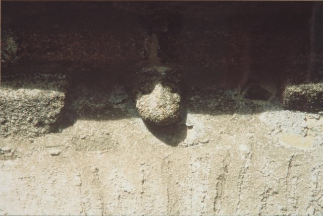 094. Saint-Jean-le-Thomas. Le chœur pré-roman et son mur nord. L'appareil des maçonneries est fait de moellons de granit assez réguliers pris dans d'épais joints de mortier. Photo d'Alain Dermigny. [Alain-047]