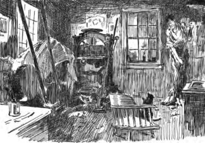 I went up the steps to the little porch and looked in at the doorway. I shall never forget the odour of printer's ink which came warmly to my nostrils, the never-to-be-forgotten odour of printer's ink, sweeter than the spices of Araby, more alluring than attar of roses!...[Pg 14] It was a long, low room, with pasted pictures on the walls, a row of dingy cases at one side, the press at the farther end, the stones near it, and a cutting machine with its arm raised aloft as though to command attention. The editor's desk in the corner was heaped so high with books and papers and magazines and pamphlets that another single one added to the pile would certainly have produced an avalanche—and ended ignominiously in the capacious wastebasket.