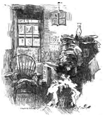 He was sitting away back in the corner of the room, by his favourite window, tipped back in his chair, with one heel hooked over a rung, the other leg playing loose in space, sadly reading the "Adventures of Tom Sawyer" which he considers the greatest book in the world—next to Robert Burns's poems.
