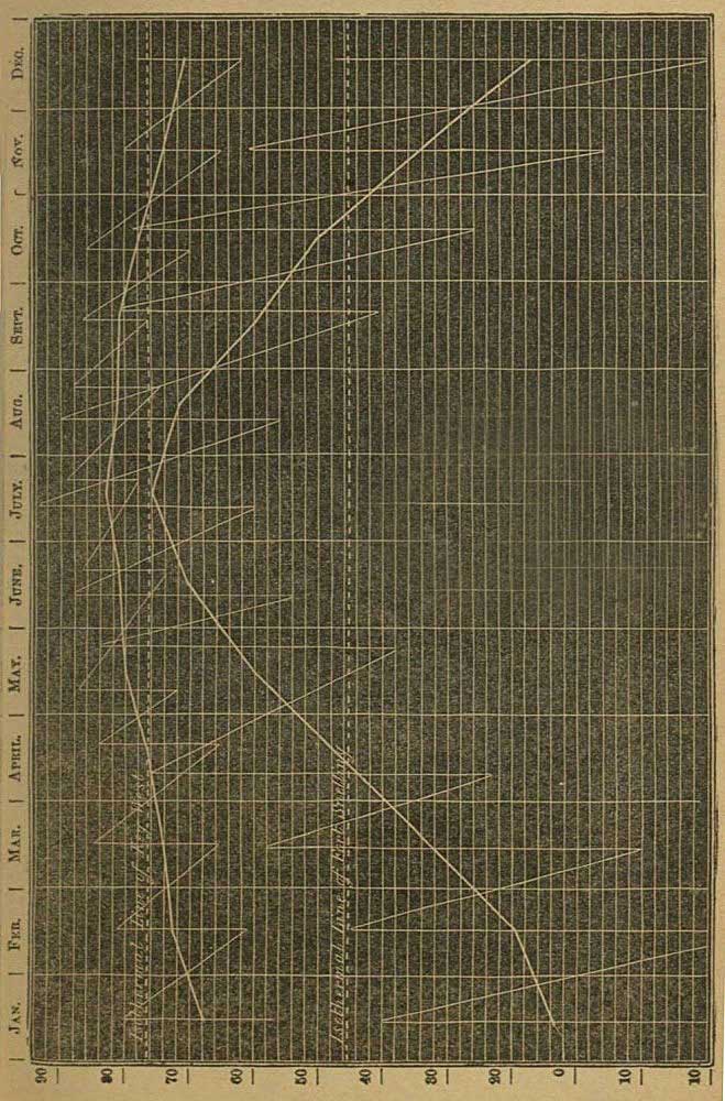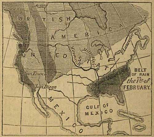 The direct action of the sun’s rays upon the earth, particularly those portions which lie north and south of the tropics, is not the only source from which the supply of heat is derived. Although there is a general increase of heat in spring and summer when the sun travels north, and of cold when he travels south in winter, yet there are frequent irregularities attending both. Very sudden and great changes occur in each of them. Frost sometimes, cool weather often, occurs in midsummer, and considerable heat and tornadoes in midwinter. And ordinarily the maxima and minima of each month and, indeed, of each week are widely apart. Even in the polar regions, in midwinter, where the sun does not shine at all, the same moderating changes with which we are conversant occur in degree. An extract or two from the register found in Dr. Kane’s narrative of the “Grinnell Expedition” will illustrate this.
