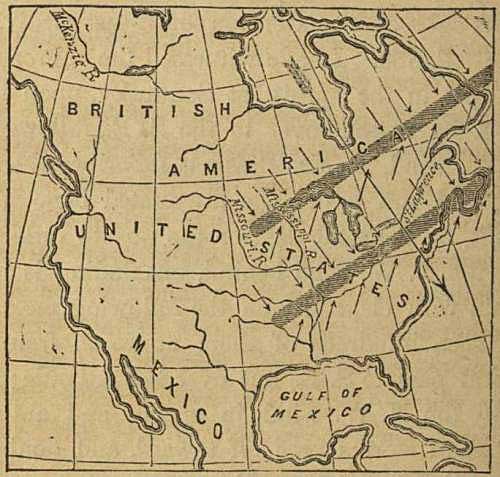 “Ah!” said I, “they are scud, forming over the central and northern portions of Connecticut, induced and attracted by[Pg vi] the influence of a storm which is passing from the westward to the eastward, over the northern parts of New England, and are traveling toward it in a southerly surface wind, which we have run into. They seem to go south, because we are running north faster than they. You see them at the eastward because they are forming successively as the storm and its influence passes in that direction, and are most readily seen in the range of the moon; but when we reach Hartford you will see them in every direction, more numerous and dense, running north to underlie that storm.”