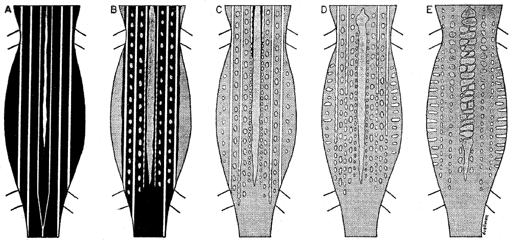 Fig. 2. Diagrammatic representation of ontogenetic change in color pattern in Cnemidophorus sacki zweifeli: A—hatchling, 34 mm. snout-vent length; B—juvenile, 55 mm. snout-vent length; C—subadult male, 80 mm. snout-vent length; D—small adult male, 100 mm. snout-vent length; E—large adult male, 120 mm. snout-vent length.