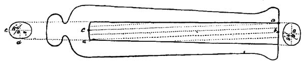 The projectile was a wrought iron shell of the form and size indicated in Fig. 20, as ascertained by measurement of one found in the trenches at Sebastopol.