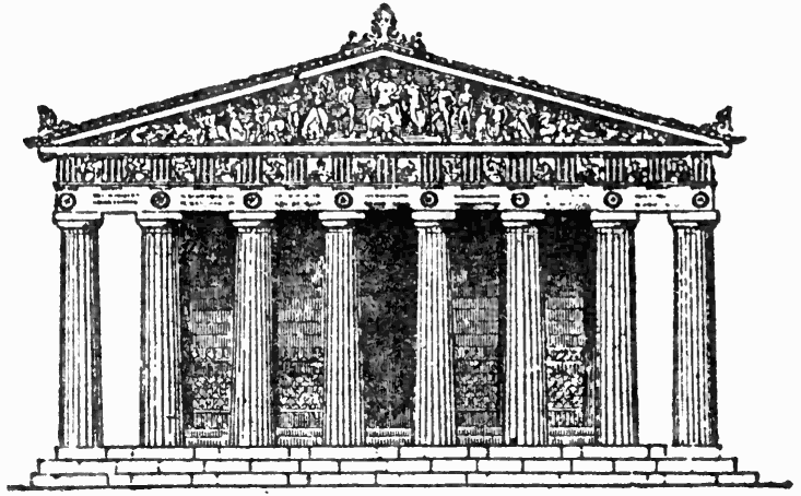 The grand temples of Greece were built either of stone or of marble. As a general rule they are set on a platform to which a long flight of steps lead up, and are enclosed within an outer wall or a continuous colonnade. Their plan is extremely simple: a parallelogram, formed in some cases entirely of columns, in others with walls at the side and columns at the ends only, encloses a second and considerably smaller pillared space known as the cella or naos, that enshrined the image of the god to whom the building was dedicated, and was entered from a pronaos or porch, and with a posticum or back space behind it, sometimes supplemented by a kind of second cella called the opisthodomus or back temple. The front columns at either end are spanned by horizontal beams that uphold a sloping gable called a pediment, the flat, three-cornered surface of which is generally adorned with sculpture in bas-relief, and along the side-columns is placed what is known as the entablature, that consists of three parts, the architrave resting on the capitals of the columns, the frieze above it and the cornice, the last of which sustains the flat roof, usually covered with tiles or marble copies of tiles.