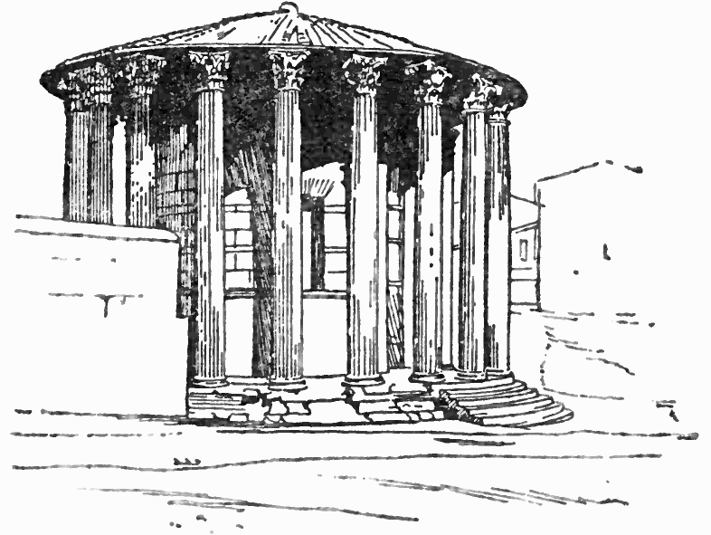 Other circular temples of Roman origin, but on a much smaller scale than the Pantheon, are the Temple of Vesta and that in the Forum Boarium, Rome, the latter much injured and spoiled by a modern roof quite out of character with it; the one at Tivoli near the capital, known as that of the Sybils, still beautiful in spite of the loss of much of its entablature and many of its columns; the Temple of Jupiter at Spalato with a domed roof upheld by columns; and that at Baalbec, which has the distinctive feature of a curved instead of a perfectly flat entablature.