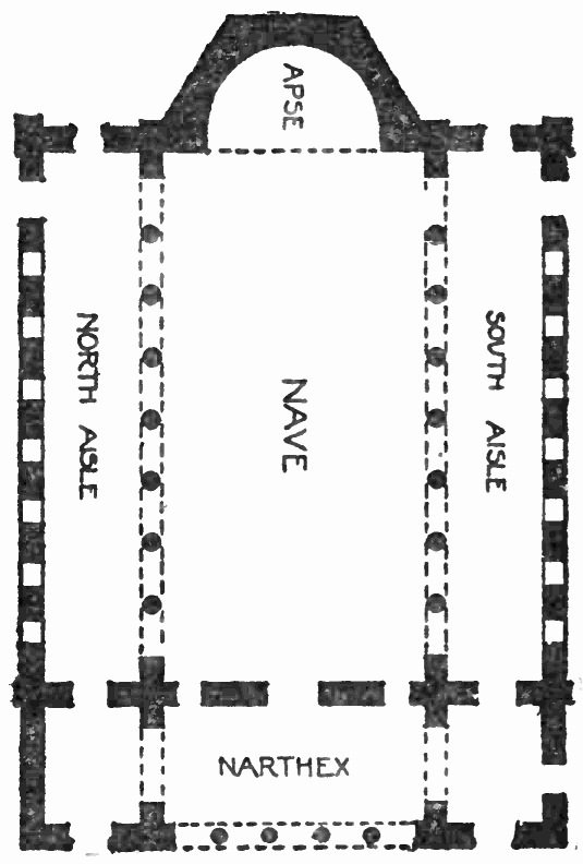 Some few early Christian churches were possibly modelled on classic tombs such as those referred to in the chapter on Roman architecture, but the more usual form was the basilican, the altar having been placed on the raised platform within the semicircular apse at the eastern end, the bishops and clergy occupying the seats assigned in halls of justice to the prætor and his assessors, whilst the congregation met in the nave and aisles. Ere long, however, to this general plan was added the distinctive feature of transepts or transverse passages running across the entrance to the apse, thus giving to the whole building the form of a cross. Later structural changes were the erection of an arch above the altar, the heightening of the nave, the connecting of the columns between the nave and aisles by arches instead of horizontal architraves, the introduction of windows, to which the collective name of the clerestory or the clear-story was given, in the semicircular heads of the arches and more rarely into the upper part of the low external walls of the aisles, the apse, which was gradually lengthened eastwards, being left comparatively dark, the only light proceeding from the main body of the church. Simultaneously with or in some cases earlier than these alterations, a portico known as the narthex was added at the western end, extending across the whole width of the nave and aisles, for the use of those, such as catechumens or penitents, who were not privileged to enter the church itself. The narthex in its turn was set within an atrium or outer colonnaded court, in the centre of which was a fountain, used by worshippers for ablutions before entering the consecrated building.