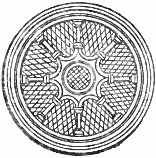The earliest Roman works of architecture were of a purely utilitarian character, and in addition to the Cloaca Maxima already mentioned the most noteworthy still in existence are the bridges over the Tiber, the aqueducts of the Campagna outside Rome, and the so-called Pont du Gard at Nîmes, France. The most ancient temples greatly resemble those of Greece, and amongst them may be named as specially typical those of Fortuna Virilis and of Antoninus and Faustina, both now in use as churches, and that of Venus and Rome, all in the capital, that of Diana at Nîmes known as the Maison Carrée, and that of the Sun at Baalbec. Of later date are the beautiful circular temples, of which the grandest example is the Pantheon of Rome, built under Hadrian about A.D. 117, in which Roman architecture reached its noblest development. The colonnaded porch with entablature and pediment, that detracts so much from the external effect of this magnificent building, did not originally belong to it, but formed the entrance of a temple built by Agrippa more than a century before, and was added to the Rotunda after the completion of the latter. The internal diameter of the Pantheon is 142 feet 6 inches, and its height at the apex of the dome is the same; its walls are 20 feet thick, and its concrete dome is adorned with deeply recessed panels or coffers and has a single circular opening at the crown through which alone light is admitted. The floor is of marble; bronze pilasters flank doorways of the same metal, the oldest existing specimens of their kind, and it is supposed that when first completed the whole of the outside was cased in white and the inside in coloured marbles.
