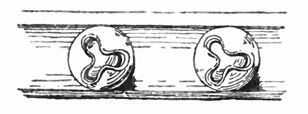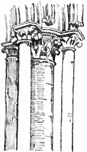 The Ionic and Corinthian orders are alike characterised by lightness and grace rather than massiveness and simplicity. In both, the columns, instead of rising direct from the platform, have a complex base consisting of a number of circular mouldings above another, the fluted shafts are comparatively slim and tapering, and the channels in them are divided by spaces called fillets. In the Ionic order the flat abacus of the Doric capital is replaced by two coiled volutes projecting beyond the echinus on either side, and the horizontal portion between the volutes is surmounted by finely carved leaf mouldings. The Corinthian order is specially distinguished by the ornate decoration of the capitals, that represent calices of flowers and leaves, chiefly those of the acanthus, arranged so as to point upwards and curve outwards in much the same style as they do in nature. The architrave in both the Ionic and the Corinthian orders consists of plain slabs, but the frieze—which is not divided as in Doric buildings into triglyphs and metopes—is in nearly every case enriched with a series of beautiful figure subjects, and is therefore known as the Zoophorus or figure-bearer.