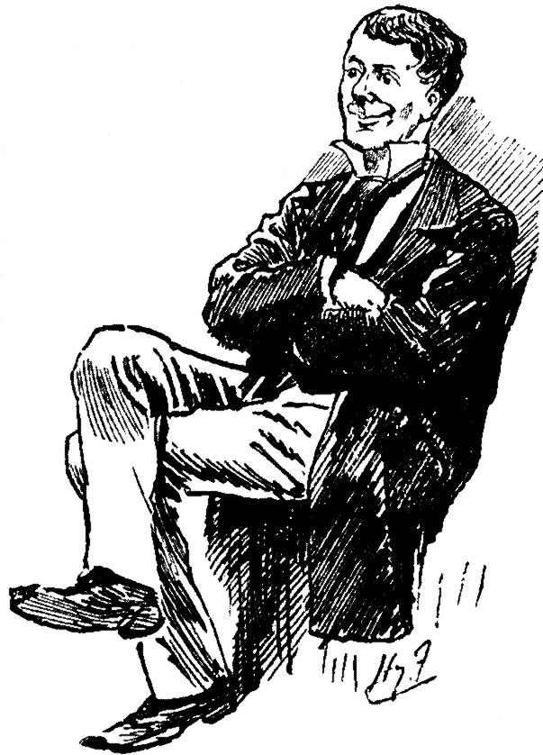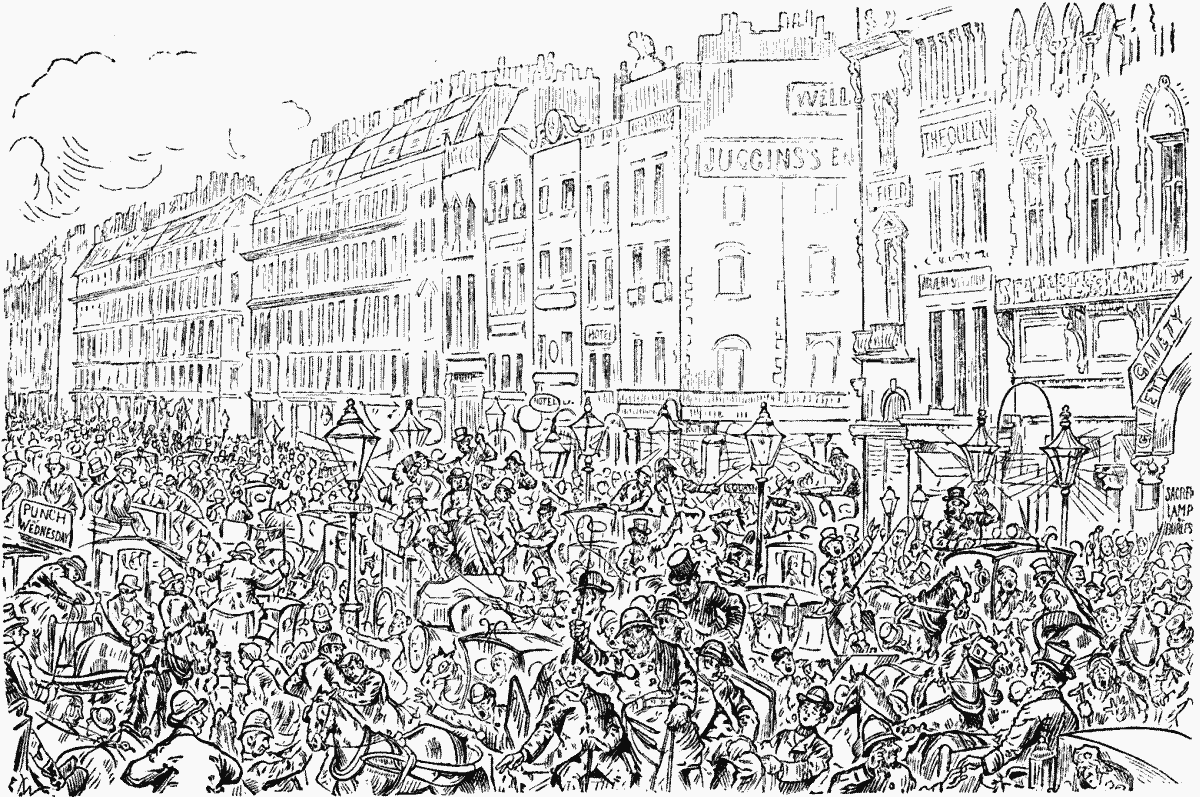 He sat, or rather grovelled, amongst a pile of daily newspapers. His eyes were wilder, much wilder, than the Wild West of Buffalo-Bill, his hair was as dishevelled as that of an infuriated Irish M.P. after an All-night Sitting. He looked as mad as a hatter.