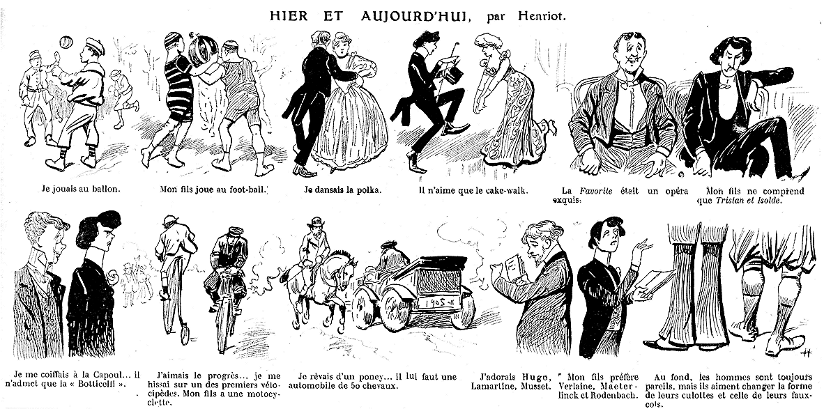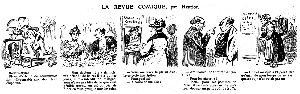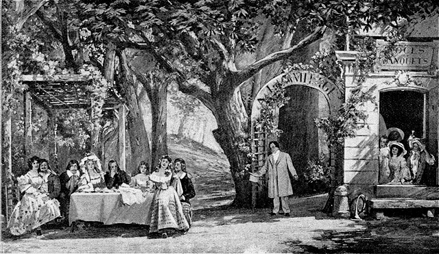 ...Au restaurant Fayot. Dans un coin, une table fleurie, encombrée de flacons de liqueurs et de boîtes de cigares, autour de laquelle cinq personnes achèvent de dîner. Cigares et flacons sont intacts. On boit du tilleul en fumant des cigarettes. Le Parisien devient sobre. Neurasthénique ou gastralgique, il dédaigne (ou redoute) le tabac fort et les spiritueux; et l'on ne vient plus «au cabaret», comme ils disent, pour bien boire ou pour bien manger, mais pour bavarder à l'aise une heure ou deux, dans un joli décor, hors de chez soi. Mes voisins causent à demi-voix, mais assez haut pour qu'il me soit facile d'entendre ce qu'ils disent. Ils m'intéressent; ils s'entretiennent un peu de tout: du nouveau ministère, des bagarres russes, de la pièce d'hier, de l'exposition du cercle Volney, du dernier Salon des miniaturistes.