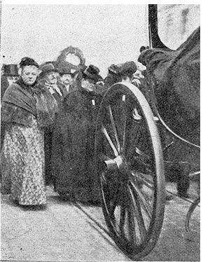 | Le cortège funèbre sortant de Paris par la porte d'Asnières. | Mme Séverine prononçant son discours au cimetière de Levallois-Perret. |