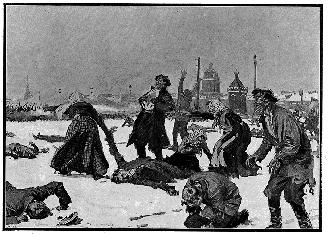 22.--Conflits sanglants, à Saint-Pétersbourg, entre les troupes et les grévistes qui veulent, le pope Gapone à leur tête, apporter au tsar, au palais d'Hiver, une pétition réclamant une constitution politique et énumérant des revendications économiques. Le tsar est resté à Tsarskoïé-Sélo. Nombreux tués et blessés.