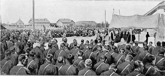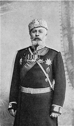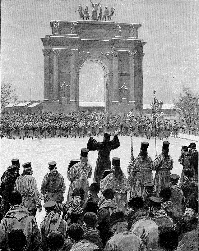 Presque tous les jours, Kouropatkine dérobe quelques instants à son accablante besogne et sort pour inspecter un détachement nouvellement débarqué, pour visiter un convoi de malades ou de blessés. Un Caucasien très armé, son garde du corps fidèle, le Roustan du général russe, est constamment à son côté. Une troïka, attelée de trois bêtes magnifiques, des chevaux tout noirs, l'équipage russe, le cocher portant la robe très ample et cette curieuse coiffure, un diadème orné de plumes de paon. Par derrière, caracolent les officiers d'ordonnance, puis la masse des cosaques sibériens, montés sur des chevaux mongols, des chevaux à moitié sauvages, hirsutes, ébouriffés, remuant avec une rapidité folle leurs jambes petites et nerveuses; les longues lances dont les cosaques sont armés, ressemblent à une forêt mouvante, et, dans d'épais brouillards de poussière, le généralissime et sa suite disparaissent prestement.