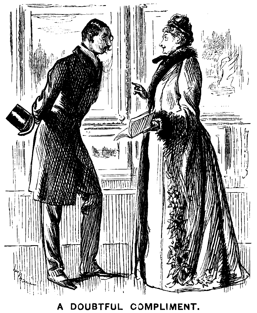 "Oh yes, Sir Gus, my Husband's as well as ever, thank you, and hard at work. I've had to copy out his Pamphlet on Bi-metallism three times, he alters it so! Ah, it's no sinecure to be married to a Man of Genius. I often envy your dear Wife!"