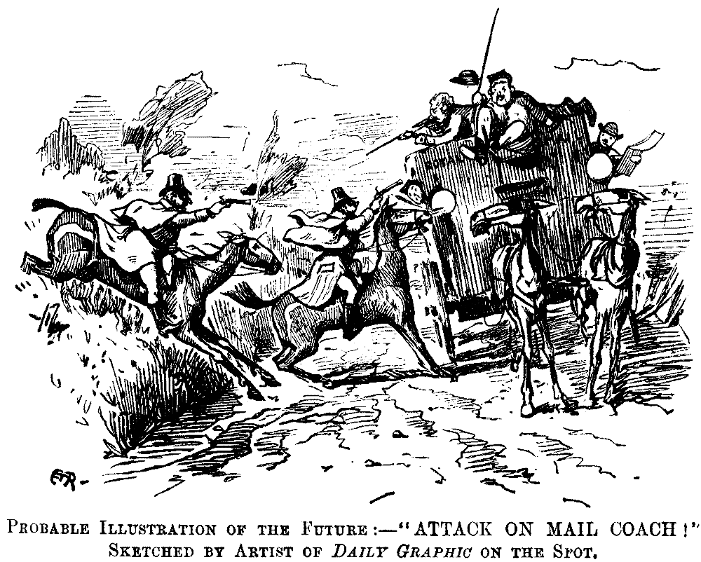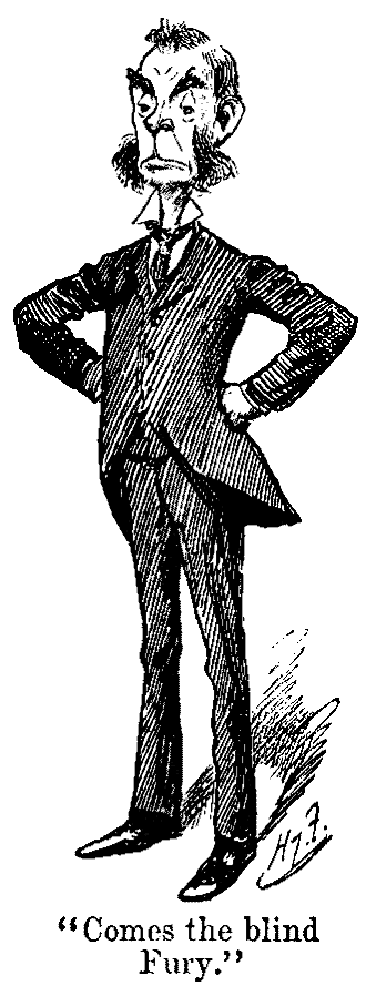 Verb. (bitterly). And that thing is my affianced husband! Ah, no, I cannot go through with it, he is too repulsive! If I could but find a way to free myself without compromising poor Papa. The sofa-cushion! Dare I? It would be quite painless ... Surely the removal of such an odious wretch cannot be Murder ... I will! (Slow music. She gets a cushion, and presses it tightly over Spiker's head.) Oh, I wish he wouldn't gurgle like that, and how he does kick! he cannot even die like a gentleman! (Spiker's kicks become more and more feeble, and eventually cease.) How still he lies! I almost wish ... Mr. Spiker, Mr. Spi-ker!... no answer—oh, I really have suffocated him! (Enter Sir Posh.) You, Papa?