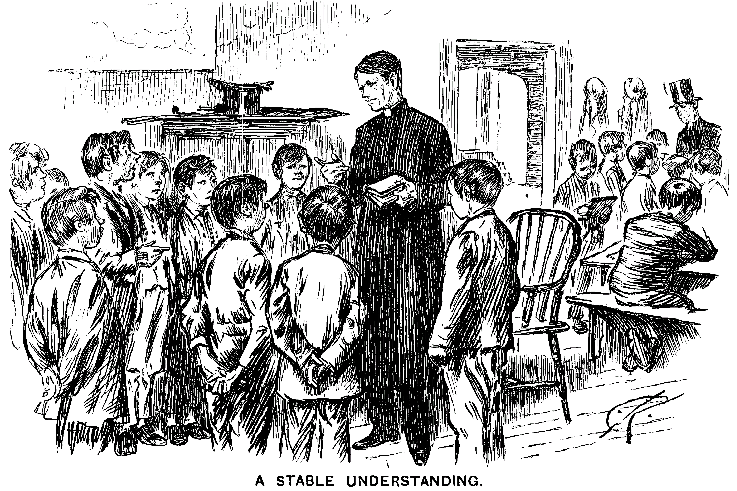Spiker (throwing himself on sofa without seeing Verb.) I don' know how it is, but I feel precioush shleepy, somehow. P'raps I did partake lil' too freely of Sir Poshbury's gen'rous Burgundy. Wunner why they call it "gen'rous"—it didn't give me anything 'cept a bloomin' headache! However, I punished it, and old Poshbury had to look on and let me. He-he! (Examining his hand.) Who'd think, to look at thish thumb, that there was a real live Baronet squirmin' under it. But there ish!