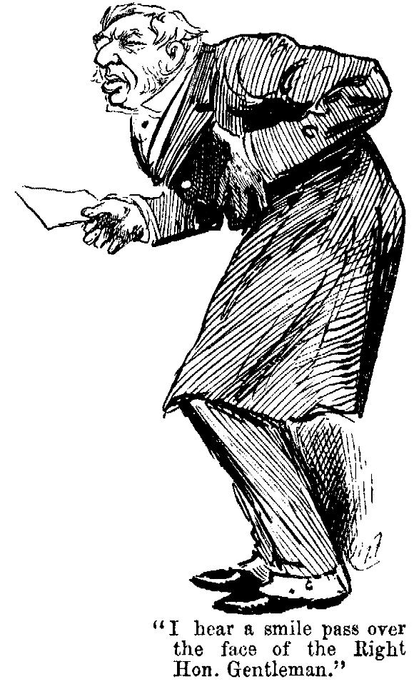 Sir Posh. Who, as a matter of fact, was innocent—but I forgive you, child, for your unworthy suspicions. Bleshugh, my boy, you have saved me from unnecessarily depriving myself of the services of an old retainer. Blethers, I condone a dissimulation for which you have done much to atone. Spiker, you vile and miserable rascal, be off, and be thankful that I have sufficient magnanimity to refrain from giving you in charge. (Spiker sneaks off, crushed.) And now, my children, and my faithful old servant, congratulate me that I am no longer——