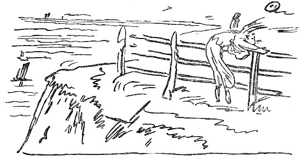 There was a great wind yesterday—Boreas had been taking concentrated essence of ginger—It fairly took me off my legs once as I was walking along the cliffs to Broadstairs, luckily for me it blew off the sea—and I was brought up short by some railings in this wise—[see page 22] otherwise I should (no doubt) have been carried across a 5 acre field of Cloveria Trifolia Browniensis.—I am glad to say I was also of service to humanity yesterday—I heard the shrill shrieks of a child and a woman's cry for help behind me—I turned—and saw there was not a moment to lose, the wind had caught a poor child—'s hat (and woman's too) and bore it rapidly to the edge of the cliff—with my usual agility I bounded over the rails fencing the cliff—and saved—yes, saved the child—'s—'at!—another puff and it would have been in the deep, deep sea—the blue, the fresh, &c.—Stout mama thanked me politely, and turning to her husband (who, of course, had come up too late to be of any use—those husbands always do)—she remarked "That the vind had blown both her and her child's 'at hoff and if she'd know'd it—she wouldn't have brought the young-un hout."