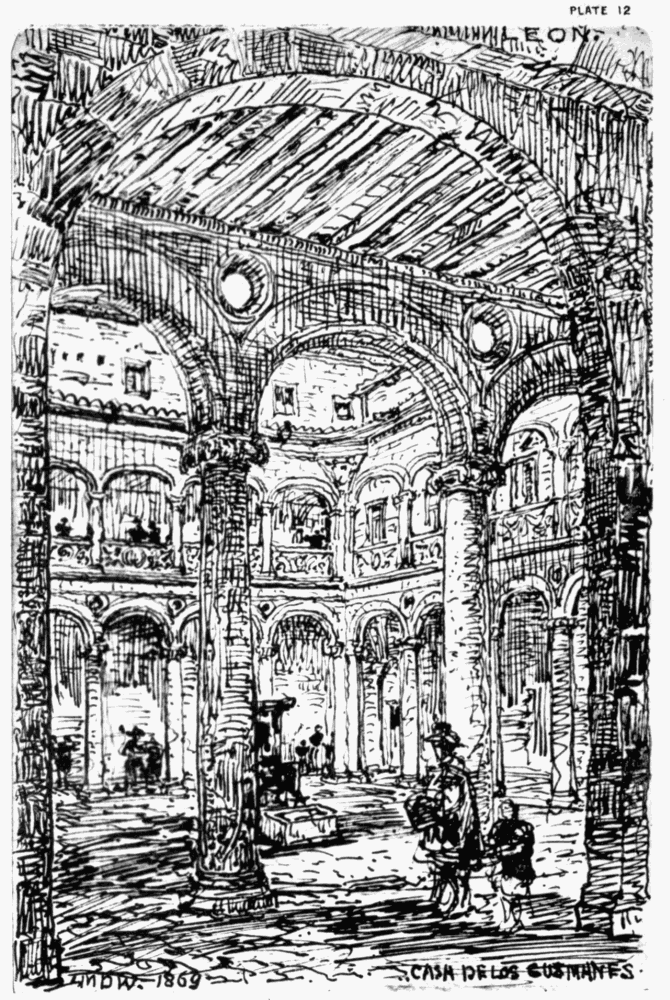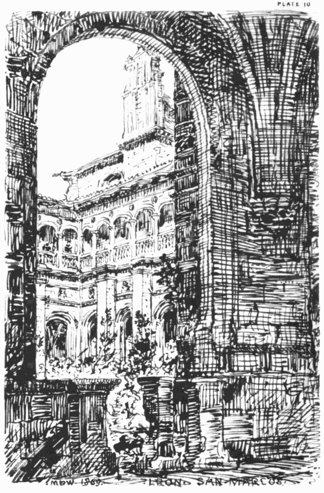 One of the most painful sensations the lover of the Art of the Past cannot but experience in Spain, is the feeling of its dissonance from, and irreconcileability with, the wants and economical necessities of to-day. The truth is that at the present moment, amongst the many difficult problems which surround and beset the ruling powers, one of the most puzzling is to find fitting uses for the many vast structures which have fallen into the hands of the Government. Churches in number and size out of all proportion to the wants of the population, monasteries entirely without monks, convents with scarcely any nuns, Jesuit seminaries without Jesuits, exchanges without merchants, colleges without students, tribunals of the Holy Inquisition with, thank God! no Inquisitors, and palaces without princes, are really "drugs in the market;" too beautiful to destroy, too costly to properly maintain, and for the original purposes for which they were planned and constructed at incredible outlay they stand now almost useless. For the most part, the grand architectural monuments of the country are now like Dickens' "used-up giants" kept only "to wait upon the dwarfs." Among a few instances of such, may be noticed the magnificent foundation of the noblest Spanish ecclesiastic, Ximenez. His College at Alcala de Heñares (see etext transcriber note) is turned into a young ladies' boarding-school; the splendid Convent of the Knights of Santiago at Leon, the masterpiece of Juan de Badajoz, dedicated to Saint Mark, and one of the finest buildings in Spain, is now in charge of a solitary policeman and his wife, awaiting its possible conversion into an agricultural college; the grand Palace of the Dukes of Alva at Seville is let out in numerous small tenements and enriched with unlimited whitewash; the Colegiata of San Gregorio at Valladolid, another of the magnificent foundations of Cardinal Ximenez, and the old cathedral at Lerida, the richest Byzantine monument in Spain, are now both barracks;—the vast exchanges of Seville and Saragossa are tenantless and generally shut up; the beautiful "Casa de los Abades" at Seville is converted into a boy's school and lodging-house for numerous poor tenants, the Casa del Infante at Saragossa, containing the most richly sculptured Renaissance Patio in Spain, is chiefly occupied as a livery stable-keeper's establishment; Cardinal Mendoza's famous Hospital of the Holy Cross at Toledo is now an Infantry College; the great monastery of the Cartuja near Seville, with one of the finest Mudejar wooden ceilings in the country, is turned into Pickman's china factory; the "Taller del Moro" a model Moorish house with its beautiful decorations, at Toledo, is now only a carpenter's workshop and storehouse; the celebrated establishment of El Cristo de la Victoria at Malaga, with all its glorious associations with the "Reyes Cattolicos," is occupied as a military hospital; and so on 'ad infinitum.'