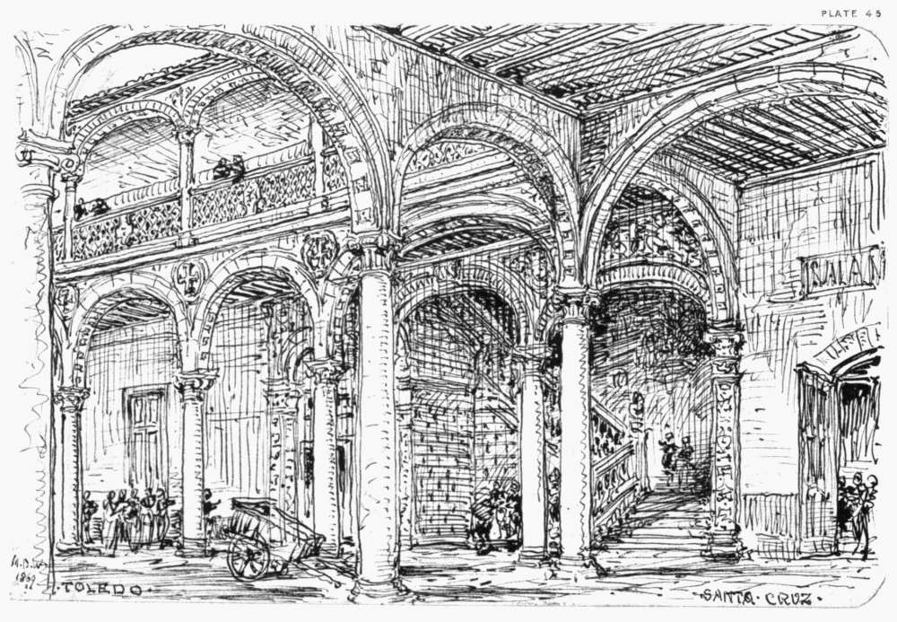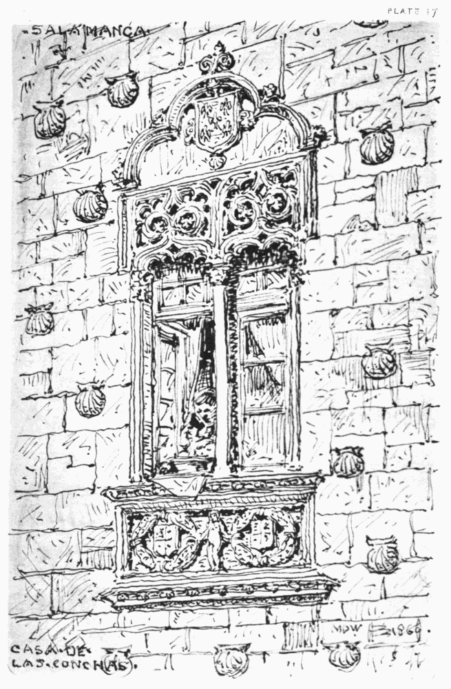 I have further to ask corresponding indulgence for any literary insufficiencies my text may present. Although for some years a not inattentive student of Spanish art and literature, I could not, and cannot but feel that my acquaintance with the country was, and is insufficient for writing worthy notes even upon its architectural monuments, after the excellent works which have been already written by such of my countrymen as Ford, Street, Stirling, and O'Shea. At the same time, considering that to publish my sketches altogether without explanatory letter-press would greatly detract from their interest and consequent usefulness, I have brought into their present shape the scanty notes made upon the spot, more or less directly illustrative of the subjects upon which my pencil found occupation.
