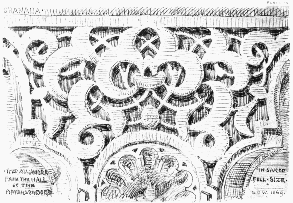 Every record the pen and pencil of any accurate observer can preserve at this juncture of the fading glories of the past in Spain is, as it were, snatching a brand from the inevitable fire which has already consumed inestimable treasures upon its soil. It was to give a stamp of truth and authenticity to the few such records I might be enabled to make, that I determined to complete them in the actual presence as it were of the object illustrated, and to admit of no intervention between my own hand, and the eye of any student willing to honour my work with his attention. My sketches might no doubt have gained in beauty by being transcribed on stone or wood by some artist more skilful than I am, but as any such alteration would detract from their simple veracity, I preferred to make them at once upon the spot with anastatic ink, in order that they might be printed just as they were executed. Working with such ink in the open air is difficult, and the result capricious, I have therefore to ask for some indulgence, and to express a hope that any shortcomings in the drawings may be overlooked in the obvious interest of the subjects pourtrayed. Could I but have known, on leaving England, that my sketches could have been so successfully transferred to collodion, and printed therefrom by the beautiful Autotype mechanical process, as they have been since my return, I might have spared myself much extra trouble and anxiety, and have probably attained a much better result with less effort. In order to retain as much "local colour" as possible, I have preferred, even in the binding of this volume, to take its ornament in fac-simile from a beautiful little Mudejar casket of which I am the fortunate possessor, rather than to trust to my own powers to design something specially characteristic.