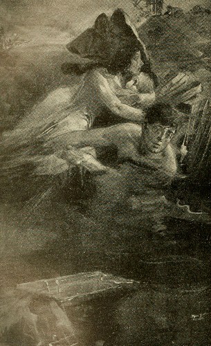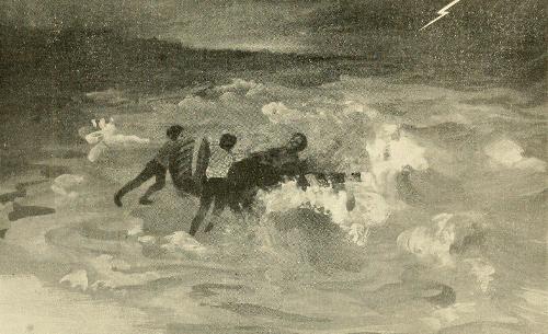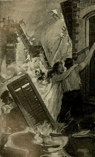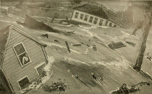 Forty thousand people—men, women and children—cowered in terror for eight long hours, the intense blackness of the night, the swishing and lapping of the waves, the demoniac howling and shrieking of the wind and the indescribable and awful crashing, tearing and rending as the houses, hundreds at a time, were wrecked and shattered, ever sounding in their ears. Often, too, the friendly shelter where families had taken refuge would be swept away, plunging scores and scores of helpless ones into the mad current which flowed through every street of the town, and fathers and mothers were compelled to undergo the agony of seeing their children drown, with no possibility of rescue; husbands lost their wives and wives their husbands, and the elements were only[Pg 35] merciful when they destroyed an entire family at once.