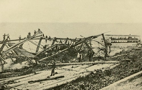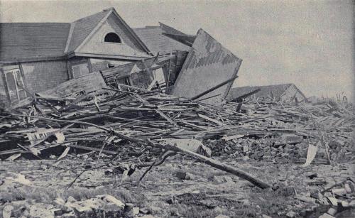 The hurricane was equally malignant, if not more fiendish and cruel, and tore great buildings and beautiful homes to pieces with evident delight, scattering the debris far and wide; telegraph and telephone lines were thrown down, railway tracks and bridges—the latter connecting the island and city with the mainland—torn up, and the mighty, tangled mass of wires, bricks, sections of roofs, sidewalks, fences and other things hurled into the main thoroughfares and cross streets, rendering it impossible for pedestrians to make their way along for many days after the waters and gale had subsided.