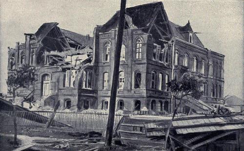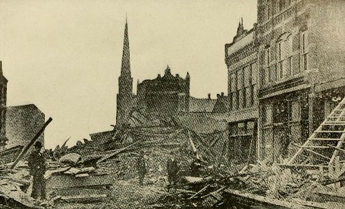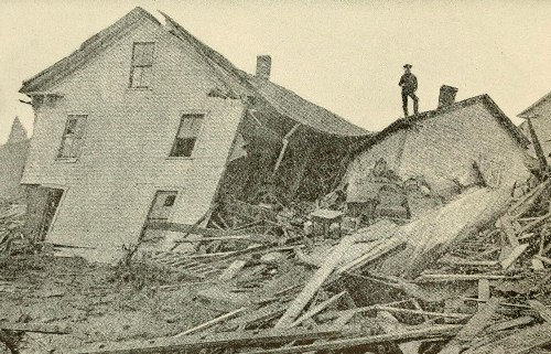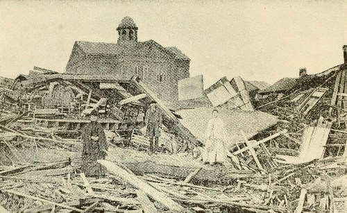 In the short space of four hours the entire site of the city was covered by angry waters, while the gale blew at the rate of one hundred miles an hour; business houses, public buildings, churches, residences, charitable institutions, and all other structures gave way before the pressure of the wind and the fierce onslaught of the raging flood, and those which did not crumble altogether were so injured, in the majority of cases, that they were torn down.