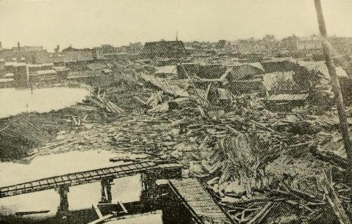 Dejection and despondency succeeded fright; the majority of the business men of the city had suffered such losses that they were overcome by apathy; nearly all the homes of the people were in ruins; the streets were impassable, and the dead lay thickly on every side; all telegraph and telephone wires were down, and as[Pg 36] miles and miles of railroad track had disappeared and the bridges carried away, there was absolutely no means of communication with the outer world, except by boat. The strange spectacle was then presented of the richest city of its size in the richest country in the world lying prostrate, helpless and hopeless, a prey to ghouls, vultures, harpies, thieves, thugs and outlaws of every sort; its people starving, and the putrid bodies of its dead breeding pestilence.