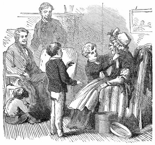 After supper Uncle Jacob read the paper aloud, while the girls washed up the dishes. All were eager to hear; and I found they kept the run of affairs quite as well as townspeople. When there was too much rattling of dishes for Uncle Jacob to be heard, and the girls lost some important item, he was always willing to read it over. Little Tommy was rolled up in a shawl and set down in the rocking-chair (that cushion did come out of it) while his mother mended his clothes. This was the way he usually got punished for tearing them. He was done up in a shawl, arms and all, and kept in the rocking-chair while the clothes were being mended, and he was obliged to remain pretty quiet, or the chair would tip. Aunt Phebe said Tommy was so careless, something must be done, and keeping him still was the worst punishment he could have.