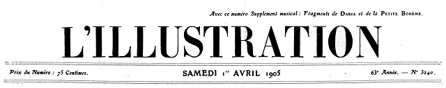 Project Gutenberg's L'Illustration, No. 3240, 1 Avril 1905, by Various This eBook is for the use of anyone anywhere at no cost and with almost no restrictions whatsoever. You may copy it, give it away or re-use it under the terms of the Project Gutenberg License included with this eBook or online at www.gutenberg.org Title: L'Illustration, No. 3240, 1 Avril 1905 Author: Various Release Date: November 17, 2010 [EBook #34349] Language: French Character set encoding: ISO-8859-1 *** START OF THIS PROJECT GUTENBERG EBOOK L'ILLUSTRATION, NO. 3240, 1 AVRIL 1905 *** Produced by Jeroen Hellingman and Rénald Lévesque