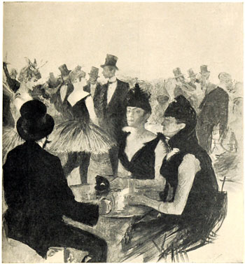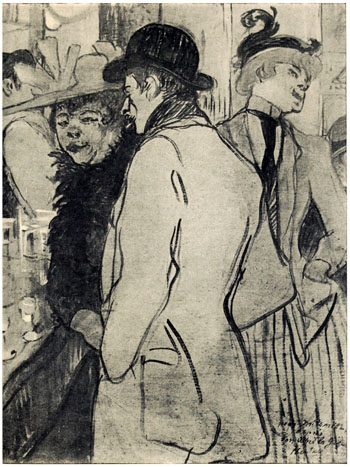 Tous les soirs, Lautrec ne manquait pas d'aller au Moulin; et il offrait à boire aux trois impériales étoiles. Pour tous, danseurs et spectateurs, il devint bientôt l'indispensable personnage à la raison d'être de la danse. Assis à sa 34 table, avec des amis, il était là, en effet, comme le bouddha, coiffé d'un melon, du quadrille et de la valse. Mais c'était un bouddha qui voyait tout, qui observait tout; et qui enregistrait la plus totale collection de gestes et d'attitudes que l'on pût imaginer!
