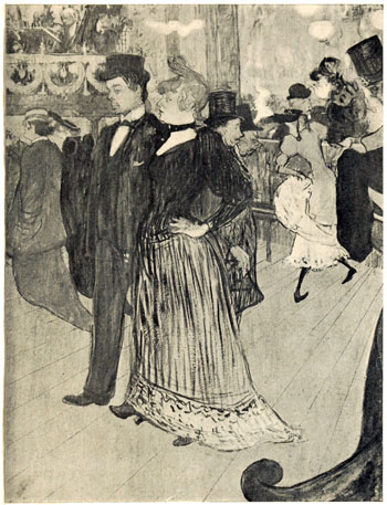 Pour lui, qui ne peut guère marcher et se fatiguer, l'essentiel, c'est de rester dans un cercle assez restreint; les boulevards extérieurs sont, d'ailleurs, peu sûrs; et le Moulin-Rouge le retiendra durant de longues années avec son amusant et exceptionnel spectacle. Lautrec se lie donc tout de suite avec Joseph Oller, le propriétaire; et il aura désormais, au bal, sa table retenue.
