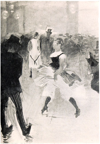La Goulue, une étrange fille, à la face d'empeigne, au profil de rapace, à la bouche torve, aux yeux durs. Sèchement elle dansait, avec des gestes nets. On l'appelait la Goulue, du temps de ses débuts au Moulin, où elle avait fait, chaque soir, le tour des tables, en vidant le fond des verres.